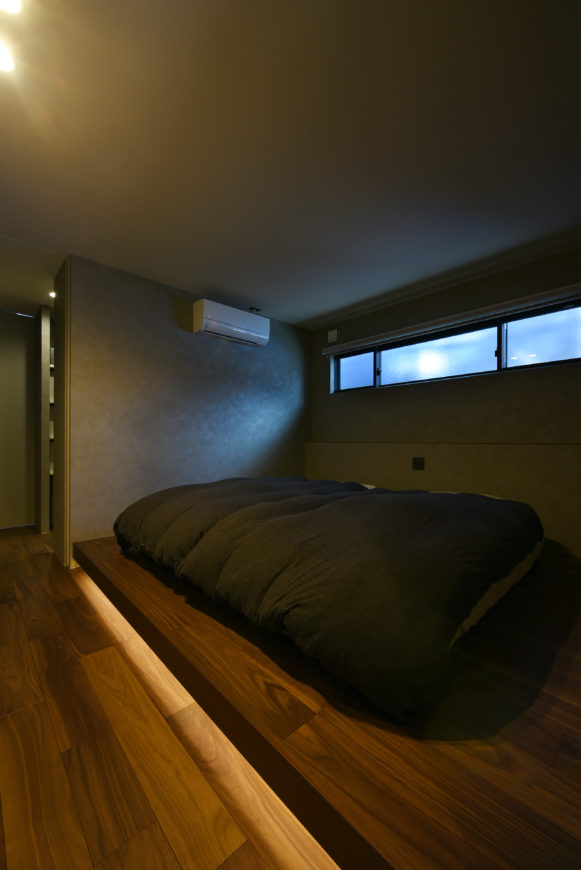 ダーク系のアクセントクロスを採用しながら、床上がり部分の間接照明と、通常の計画より控えめにしたダウンライトで明るさを取ることで、非常に落ち着いた空間を演出しています。雰囲気が非常によいですよね!