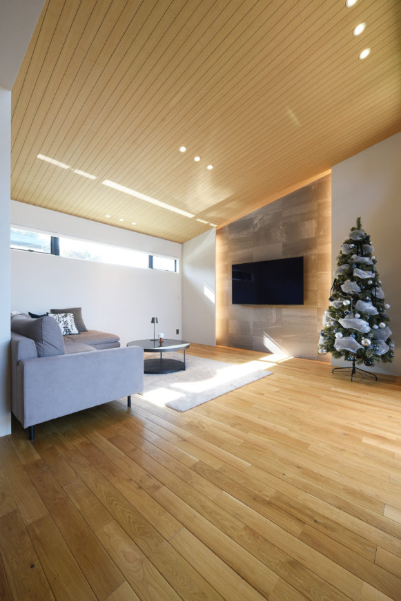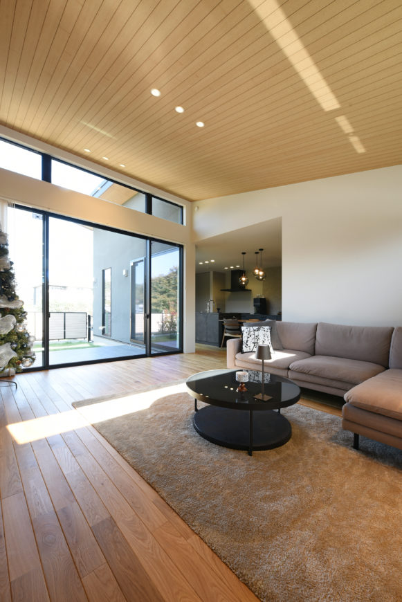 通常お庭は日当たりのよい南側に計画することが多いですが、今回の敷地では北側に開けたロケーションのため、北側の天空光で室内の明るさを確保しています。北庭×勾配天井の組み合わせによって、非常に気持ちのよい、爽やかな明るさを感じられるリビングになっています!