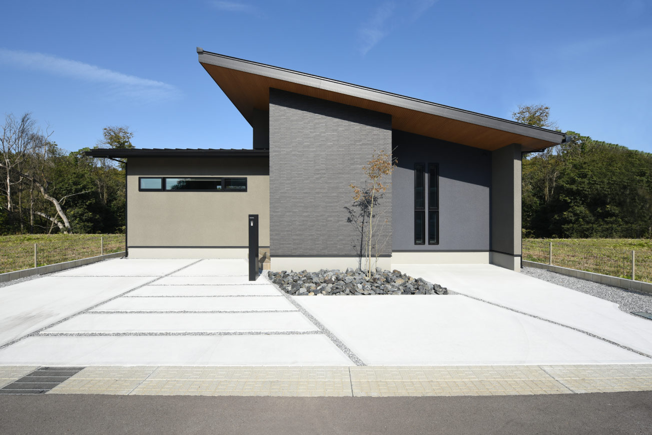 水平垂直のラインと片流れのラインが強調された非常にスタイリッシュな外観に仕上がりました。窓や屋根形状で魅せるタイプの外観ではなく、面のキレイさと縦に切り抜かれたようなダイナミックな出入り口が洗練された雰囲気を醸し出しています。