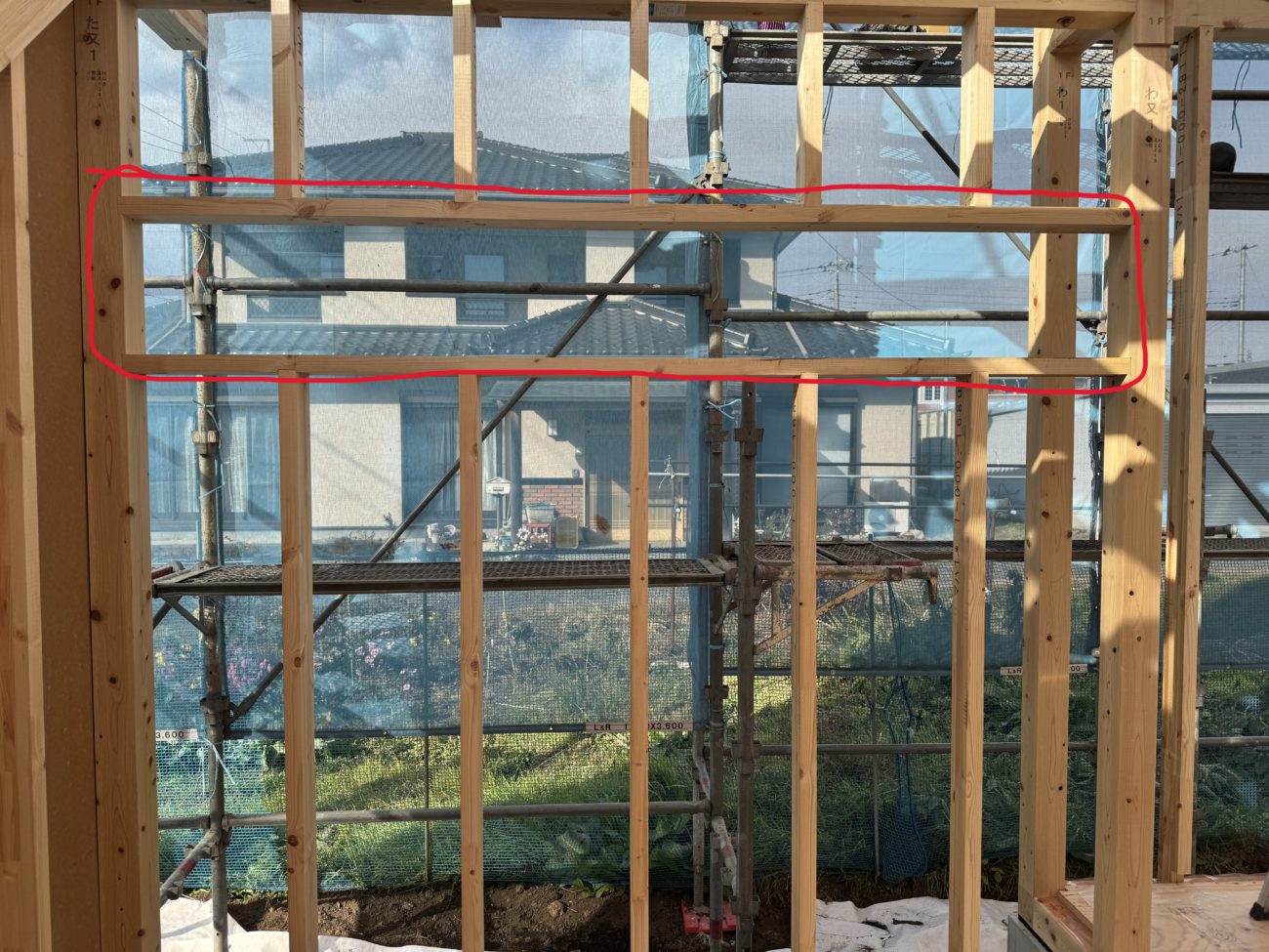 窓を設置する部分はこのように空間が開いています。窓の大きさよりも少し大きめの空間になっているので、窓を設置する前に大工が木材で微調整を行い窓を設置します。