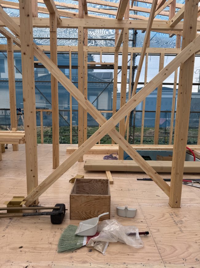 写真に写っている斜めの木材があります。これは【仮筋交い】仮止めに用いる材料で、柱が垂直に立っている事【建入れ】を確認した後に固定して柱の垂直がずれないようにしています。こちらの仮筋交いは、後々外れる材料になります、当社は建物を軸で支える、軸組み工法と面で支える工法、2×4工法に主に使われる工法を組み合わせた工法になるため、内部面材を施工するタイミングで仮筋交いを外します。