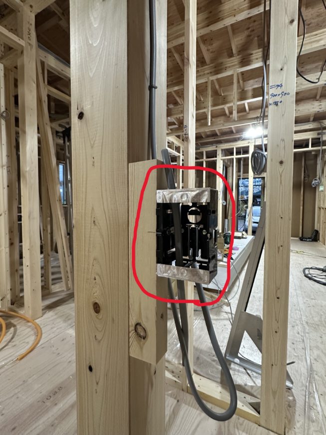 大工工事中にBOXを設置して配線を繋げる所まで行います。大工工事と壁紙の工事が終わると、BOX内に器具を付けてカバーを付けます。