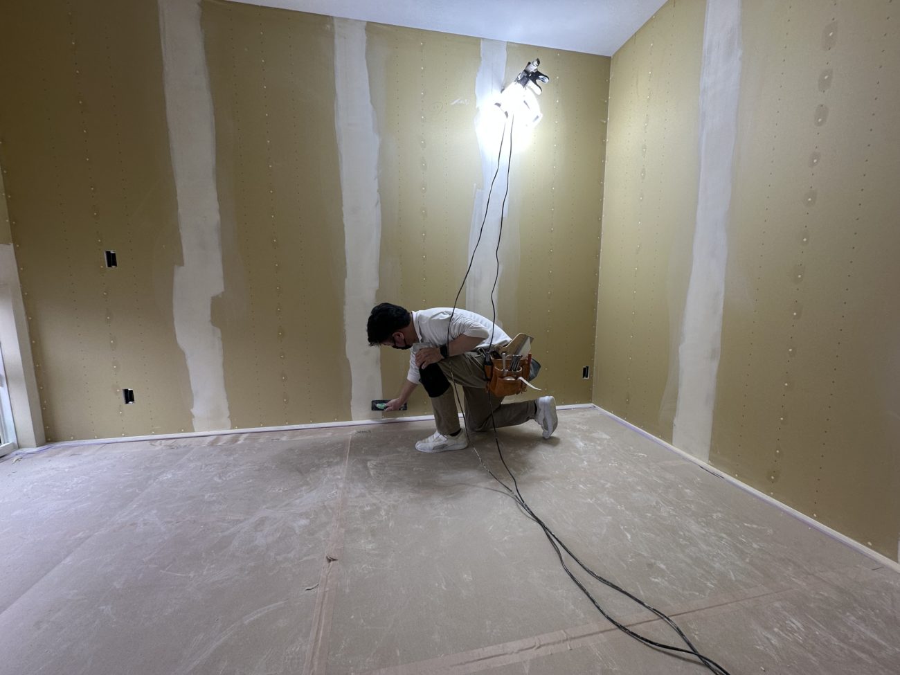 パテの重ね塗りが終わり乾燥させたあとは、壁紙を貼る面をより平滑にする為に職人が一か所ずつ丁寧にやすりがけをします。