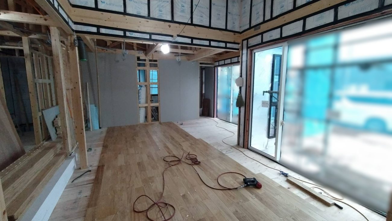 こちらは床材を貼り始めた時の写真です。床材の施工が終わると、壁紙の下地材料になる石膏ボードを壁の部分に施工していきます。