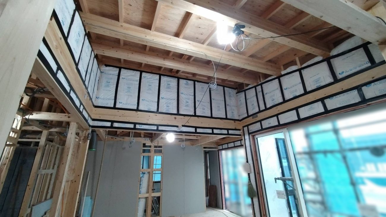 建方が終わると中の工事が着々と進んでいきます。窓が設置されるまでの間はブルーシートで養生をして雨などが室内に入らないようにしています。
