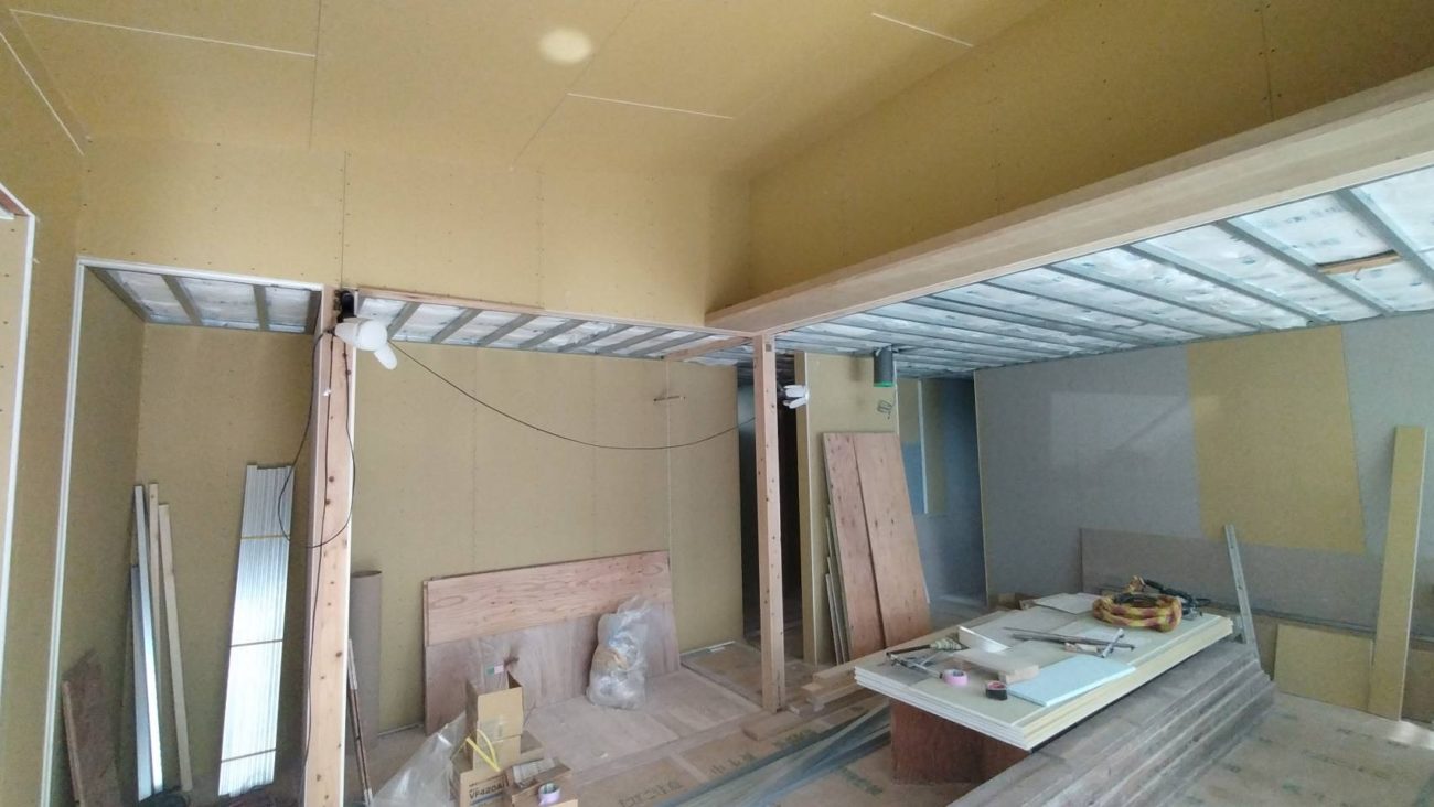大工工事が完了した現場は、写真のように壁・天井が石膏ボードの状態になります。