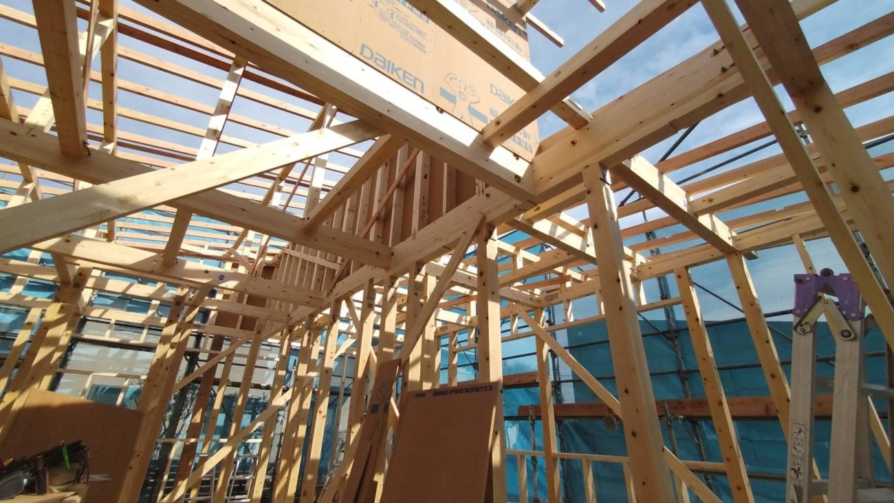 基礎工事までは建物の規模感が感じにくいかもしれませんが、柱が立ち屋根の骨組みまで組みあがると、迫力があり建物の大きさや、お部屋の大きさに実感が湧いてきます。