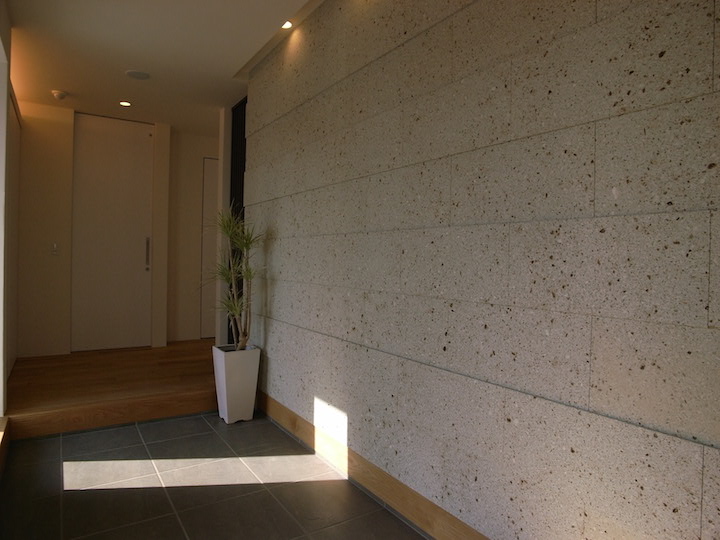 石模様のタイルで仕上げた壁は、クールな雰囲気を醸し出していますね。